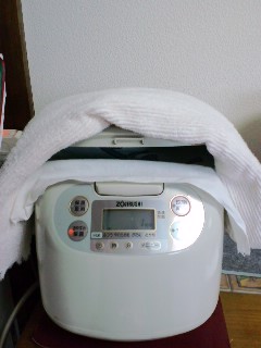 炊飯器の蓋を微妙に開け (バスタオルを重石にして)